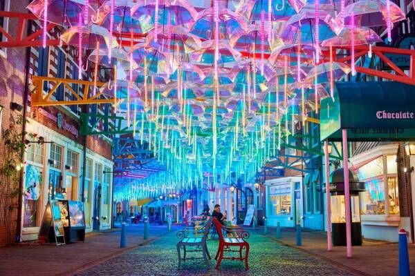 アトラクションタウン内にあるアンブレラストリートの“傘”が、4年ぶりにリニューアル。約130メートルに及ぶアンブレラストリートを新たに彩るのは、2020年6月に発売以来、一躍注目を集めたWpc.の「オーロラ傘」だ。