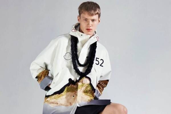 山に咲く花々のブロックプリントを施したダウンジャケットや、写実的なアルプスの写真をダイナミックに配したフード付きコートなど、自然を感じさせるデザインのアウターウェアが目を引く。モンクレール誕生の地、モネスティエ・ドゥ・クレルモンの地理や高度座標を表現したアウターも登場する。