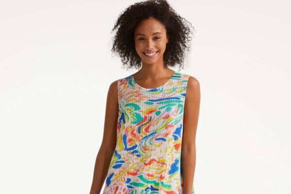 華やかな色彩のプリントが目を引く「PLAYING」のノースリーブワンピースは、ゆらめく水辺や、草木の中をくるくる駆け巡るカラフルな自然の情景をイメージ。プリーツにカラフルなプリントがプラスされることで、躍動感あふれる仕上がりとなっている。ワンピースの他、ウエストに紐を通したワイドパンツも展開される。