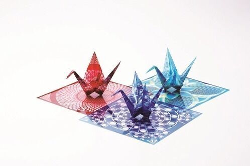 江戸切子の店 華硝とコラボレーションしたカクワの「オリエステルおりがみ」は、折れるポリエステルフィルムを使用した、水に強く破れにくい折り紙なので、好きな形におってインテリアとして使うこともできる。
