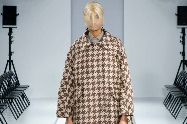ファーストルックは、等間隔に並ぶドット柄のコート。モデルはいつも通り、地面にしっかりと足をついて歩みを進める。