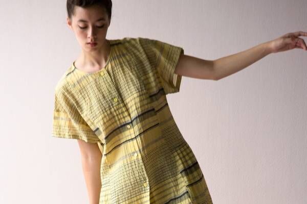 「ホリゾンタル ライン(HORIZONTAL LINE)」は、シルク糸と綿糸で柔らかな肌触りと透け感のある素材を使用し、ストライプ状に織りあげたシリーズ。ムラ染めしたヨコ糸を使用しているため、柄に“かすれ”のような風合いが生まれている。ワンピースのほか、シャツやスカートを、イエローやライトブルー、チャコールといった春らしい色合いで展開する。