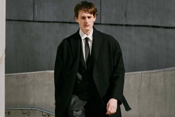 “COSMIC DUAL FORCES - MINUS -”をテーマに、東洋の陰陽思想に着目した今季のコーティー。とりわけ、江戸時代初期の芸術家・本阿弥光悦の陶芸に着想を得て、深みのある黒のファブリックを使用したそのコレクションは、さながら“陰”の肌理を示すようである。