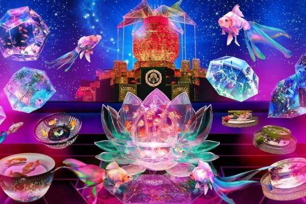 会場には、約 3,000 匹の金魚が泳ぐ巨大金魚鉢作品「超・花魁」や、最高峰の伝統工芸の技と金魚の競演「キモノリウム」、蓮の花をモチーフとした作品「ロータスリウム」といった注目展示の数々が登場。照明、音楽、プロジェクションマッピングなどの幻想的な演出と共に、美しく泳ぐ金魚たちの華麗な姿を楽しむことが可能だ。