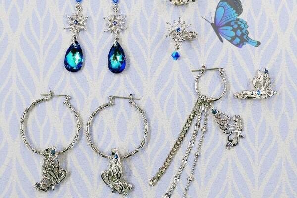 また、フープピアスとピアス(イヤリング)&イヤーカフセットは、涼し気な透かしの蝶が優雅に羽ばたくデザイン。シルバーカラーとゴールドカラーの2タイプが展開される。