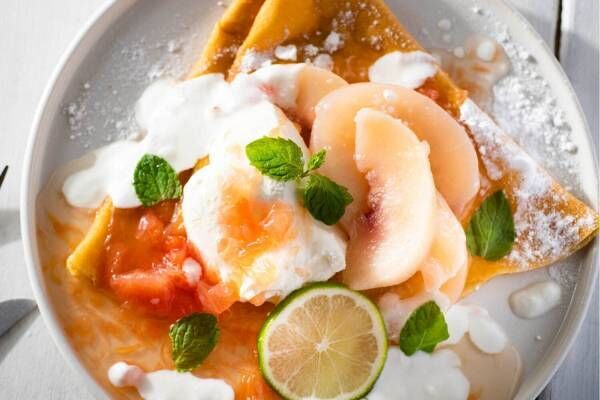 また、表参道店限定での提供となる「ペッシェ・ブリーズ」は、人気メニューのクレープを桃でアレンジした夏限定フレーバーだ。優雅に薫るローズマリーやライム、ライチリキュールでコンポートにした旬の桃を、クレープの上に贅沢にトッピング。仕上げに添えたミントグレープフルーツのジュレとバニラヨーグルトを絡めれば、みずみずしく爽やかな初夏の味わいを口いっぱいに堪能出来る。