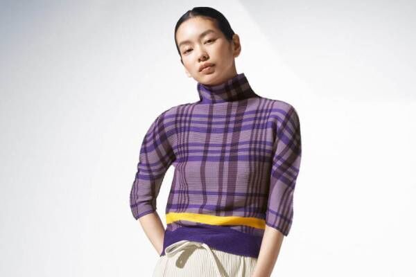 縦と横に細かいプリーツが施された、着心地の良いアイコニックな素材「ストレッチプリーツ(STRETCH PLEATS)」からは、2つのシリーズがラインナップ。「チェックプリント(CHECK PRINT)」では、パープルまたはグリーンを基調とした秋冬らしいカラーリングのチェック柄トップスを展開。いずれもウエストに鮮やかなラインを施し、アクセントを加えた。