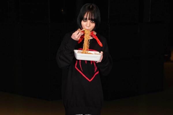 ネグレクトアダルトペイシェンツ“おなじみの”麺演出は、今季もカップ焼きそばで実施。ぷわ~と会場に広がる香ばしいソースの匂いとともに、焼きそばを頬張りながらモデルが闊歩する姿は“リアルショー”ならではの面白さがある。今季は、ロックバンド「ナイン・インチ・ネイルズ」のミュージックビデオをインスピレーションに光で会場を装飾。スクエア型に整えたランウェイに光を灯して、牢獄や檻を表現したという。なお、ランウェイにはBiSHのメンバーがモデルとして再登場し、今季もキャットウォークを披露した。