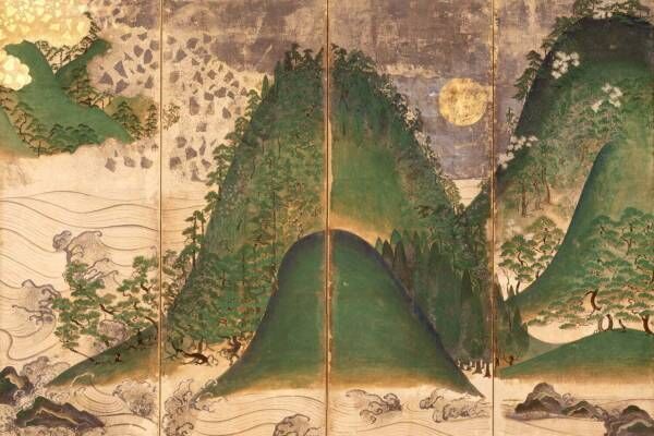 また、染紙をちぎって秋の山の彩りを表した伝藤原公任筆《伊勢集断簡 石山切》や、曽我蕭白が富士山と虹をあたたかく描き出した《富士三保図屏風》、うごめく霊山を躍動感とともに表現した谷文晁の《彦山真景図》など、多彩な山の表現を楽しめる。鮮やかな緑の色彩が目を引く国宝《日月山水図屏風》もまた、山野の織りなす神秘的ともいえる造形を大胆に描いた作品だ。