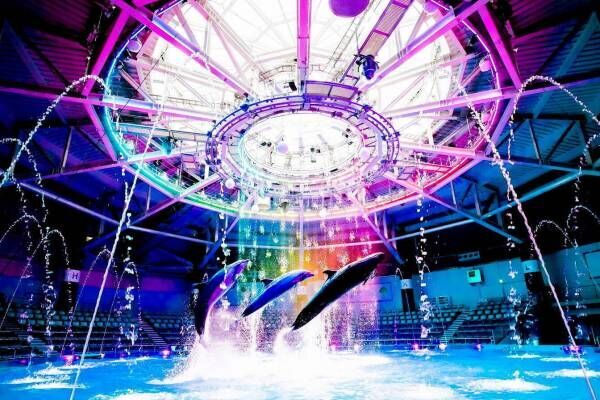 メインのドルフィンパフォーマンスは、昼夜でまったく異なる2つのプログラムを用意。デイバージョンの「ファニーパーティー!!」では、天窓から差し込むやわらかい自然光と水の演出が美しい舞台で、“ハロウィンパーティ”をテーマにしたストーリー仕立てのコミカルなパフォーマンスを披露する。イルカたちによるダイナミックなジャンプにも注目だ。