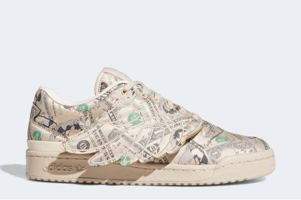 シューズのベースとなるのは、アディダスの「フォーラム ロー」。アッパーと“羽”には、100ドル札をモチーフにしたグラフィックを配している。これは、「フォーラム」がリリースされた1984年当時、100ドルで販売されていたことに由来する。