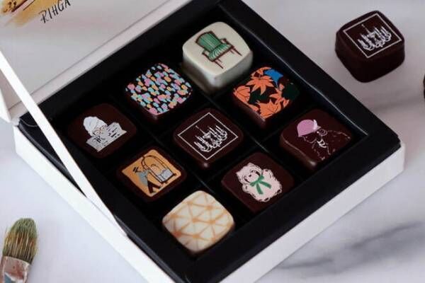 チョコレートには、ホテル館内のメインラウンジや緞通など長く愛され続けているデザインをファッショナブルなイラストで表現。たとえば、カプチーノ風味のチョコレートには、“アンティーク”をテーマにレトロな家具をデザイン。“エレガンス”がテーマのフランボワーズフレーバーには、大聖堂「ザ・クリスタルチャペル」のステンドグラスを表現した。