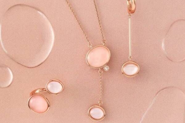 「ジュレ・ドロップネックレス」は、 大きさの違う2つのストーンをあしらったネックレス。大きいストーンは天然のピンクオパール、小さいストーンは天然のピンク色のシェルを起用。