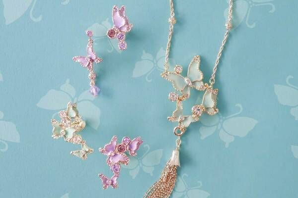 ネックレスは、きらめくカットガラスと合成樹脂を使って、バタフライを優美に表現。チェーンタッセルは取り外し可能なので、2WAYで楽しむことができる。また、イヤーカフやイヤリング(ピアス)にも、バタフライデザインが仲間入り。イヤリング(ピアス)はアシンメトリーなデザインで、コーディネートのワンポイントになるはずだ。