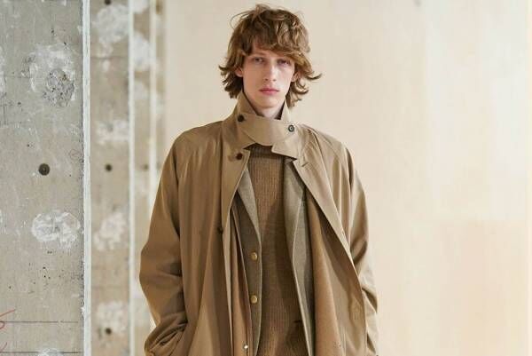 たとえば、クラシカルなムードを漂わせるツイード。ステンカラーコートやダブルブレストのロングコート、ジャケットには、ウールシルクアルパカ素材のヘリンボーンを採用した。ブラウンを基調とする奥行きのある表情と温かみのある風合いは重厚さを湛えつつも、そのテクスチャーは柔らかく、身にまとえば軽やか。あるいは、ウールカシミヤとオーガニックコットンなど、多彩なツイードを展開している。
