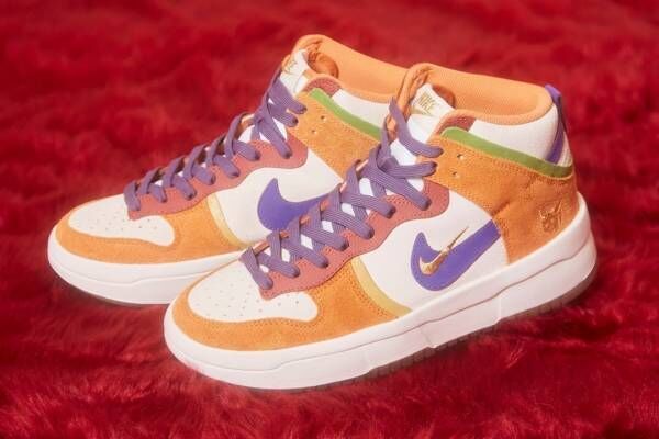 アッパーは、ホワイトをベースに、オレンジのスエード生地や赤いレザーを合わせ、力強いカラーリングに。サイドには、深いパープル×ゴールド刺繍のナイキロゴを配し、プレイフルに仕上げた。シューレースは、ロゴに合わせた紫色のほか、ホワイトが付属している。
