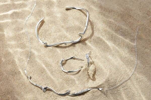 "波の揺らぎ"をイメージしたジュエリーは、大胆なウェーブラインを採用。シルバーのラインに、キラキラと輝くストーンをランダムにあしらった、ネックレス・ピアス・バングルがラインナップする。