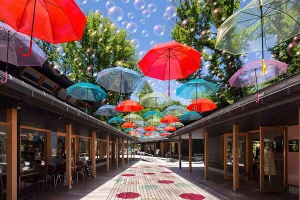 星野リゾート「軽井沢アンブレラスカイ2022」“宙に浮かぶ”カラフル傘&シャボン玉演出も