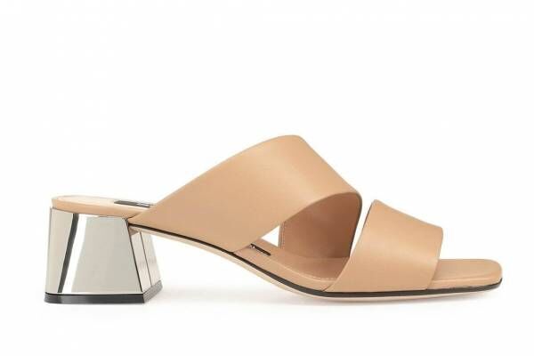新作ミュールには、足全体を包み込むように、柔らかなナッパレザーを採用。ハードな印象のメタリックハイヒールとのコントラストが、モダンな印象をもたらしている。