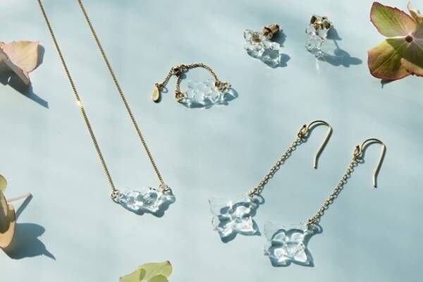 また、「アジサイプラス」シリーズとして、新作アクセサリーもラインナップ。2つの小さなアジサイの花を互い違いに連ねた、ネックレスやピアス、リングを展開する。