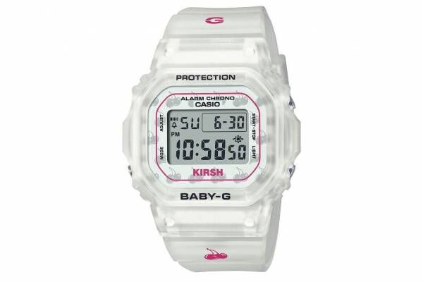 今回のコラボレーションでは、BABY-Gの定番モデル「BGD-565」をベースモデルに採用。90年代に流行したおもちゃやアクセサリーから着想を得たマットなホワイトスケルトンのケース&バンドに、キルシーの代名詞であるチェリーアイコンやブランドロゴをデザインしている。