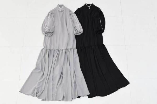 アウラアイラの新作「ジョーゼット ロング ワンピース」は、チャイナカラーからインスピレーションを得たスタンドカラーが魅力的。襟や袖に施したコントラストカラーのパイピングも目を引く。
