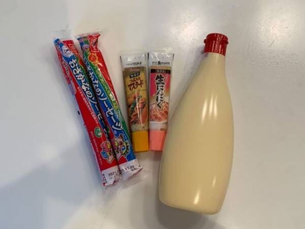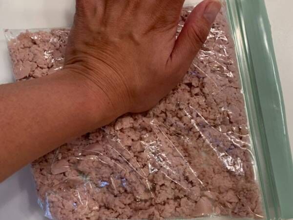 今回は魚肉ソーセージを切って袋に投入しましたが、大きい形のままの方が手でつぶしやすいようです。