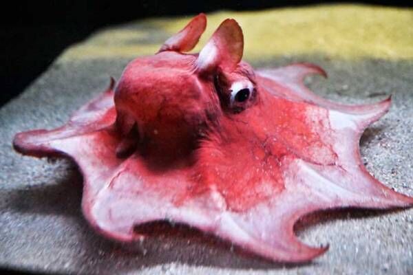 UFOのように丸く平たい体と、耳のように見えるヒレが特徴的な『メンダコ』。