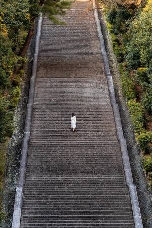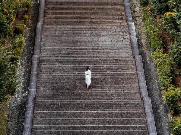 1人で立っている女性の姿が、階段の長さを強調します。