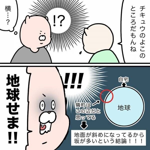 地球の地面が斜めになっているため、坂道が多いと思っている息子さん。地球の大きさなどを勘違いしているのかもしれませんね。