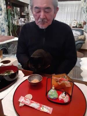 父親の料理の横には、同じようにお盆に載せて飾られた、猫用のごちそうがあります。盆の上には、ひな祭りの人形と、るるちゃんが大好きな猫用おやつ『CIAOちゅ〜る』も。