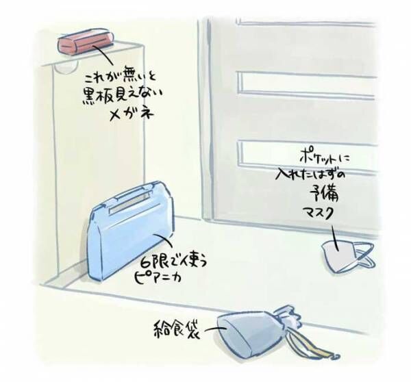 玄関にあったのは、メガネにピアニカ、予備用マスク、給食袋。