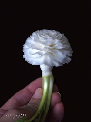 あまりにも精巧なため本物の花のように見えますが、茎部分を見ればカブだと理解できますね。