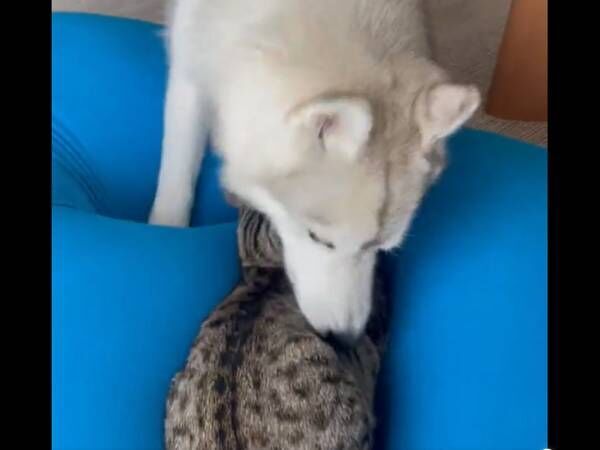 シベリアンハスキーのユキちゃんと、猫のサンちゃんは、普段からべったりとくっついて過ごすほどの仲よし。