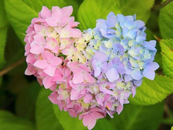 ハート型で、ピンク色と青色の2色が混ざったアジサイが美しいですね!