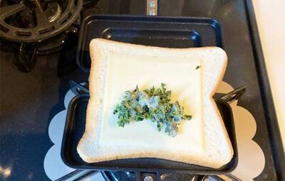作り方は簡単!ホットサンドメーカーを開いて、食パンを1枚置き、その上にチーズ、冷凍のほうれん草をのせます。