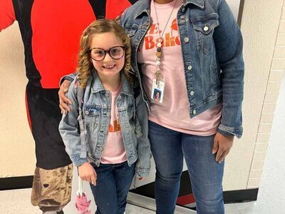 学校の名前がプリントされたおそろいのピンクのTシャツに、ジーンズ、デニムジャケット、スニーカーというペアルックを披露した、デイ先生とキャロラインさん。