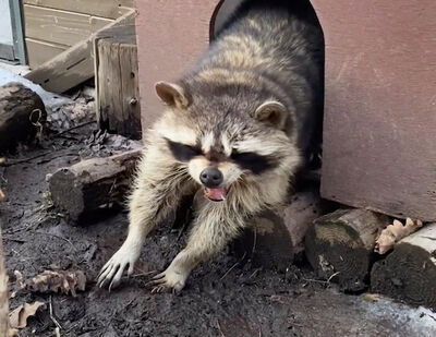 普段の愛らしさはどこへやら、まるで威嚇をしているかのようなワイルドさです。アライグマも、寝起きはややご機嫌斜めなのでしょうか。