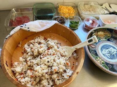 しかし、具材は乗せるだけでできますが、酢飯の方は結構作るのが面倒。少し固めに炊いたご飯に、「すし酢」を混ぜながらうちわで扇ぐというもの。