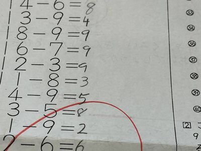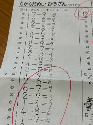 問題は、引き算。ぱっと見た時、なぜ正解なのかが分からなくなりそうな解答用紙がこちらです。