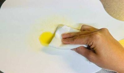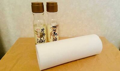 やり方はとっても簡単!まず色移りしてしまったまな板に適量の油を出し、馴染むようにキッチンペーパーで軽く擦ります。筆者はオリーブオイルを使用しました。