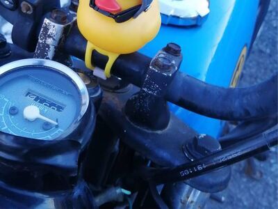 ヘルメットが色違いのアヒルをバイクにつけている同僚と、ちり紙さんはおそろいになりました。