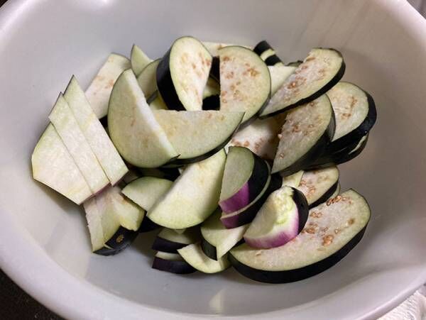 ナスを7mmほどの厚さにスライスした後、塩もみして水気を絞り、ボウルに入れます。