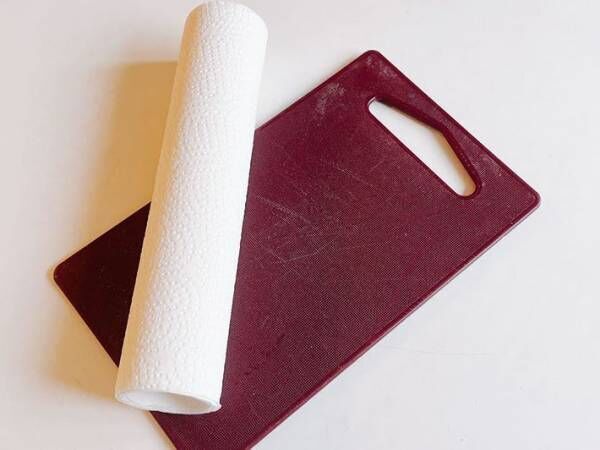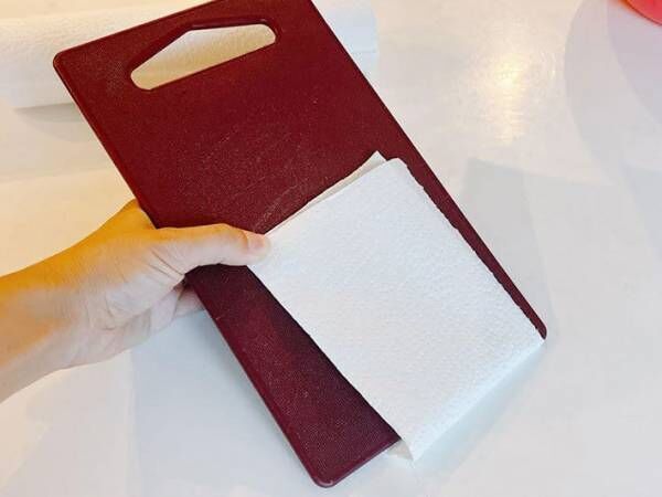 今回はまな板を使用しましたが、キッチンペーパーをしっかり押さえ付けることができれば、トレーや下敷きでも代用できます。