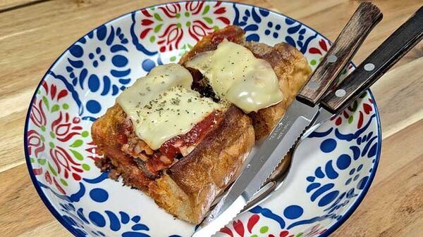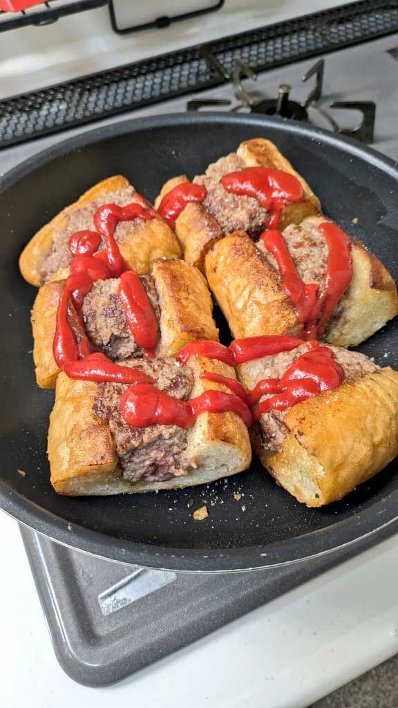 肉ダネを詰めたフランスパンを、じっくり焼いて、しっかり火を通して作ったといいます。