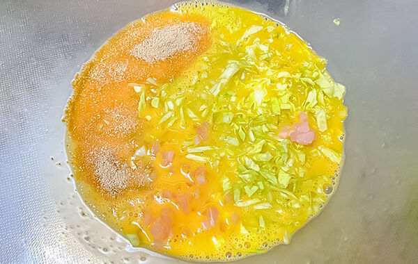 卵をすべてボウルに割り入れ、箸で切るようにしてよく混ぜてください。
