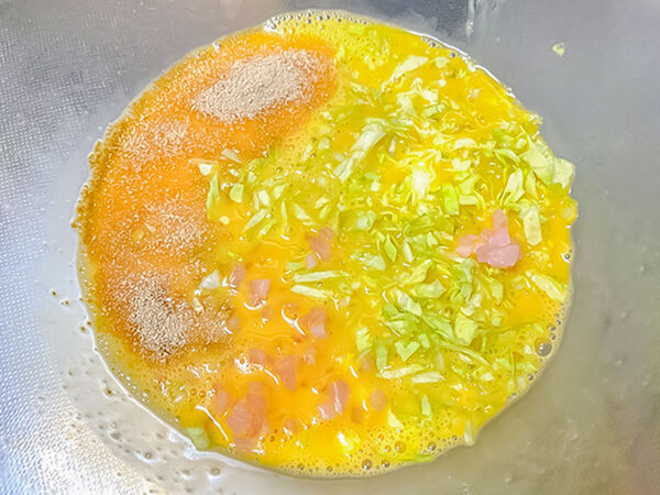 そこに、和風顆粒だし、みじん切りにしたキャベツと紅ショウガを加えます。