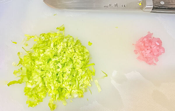 キャベツと紅ショウガをみじん切りにします。