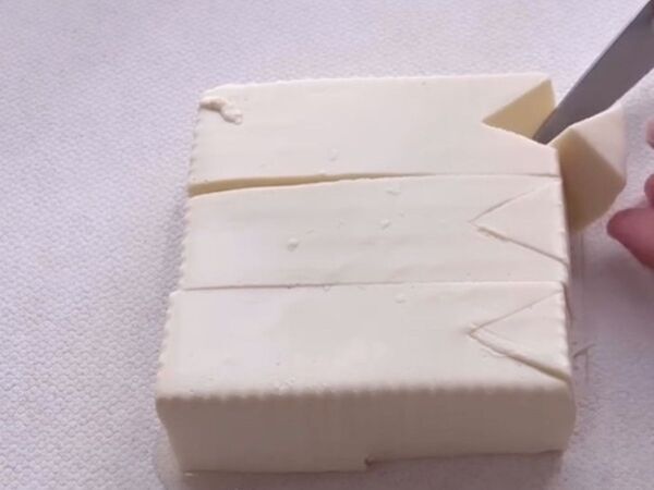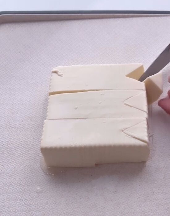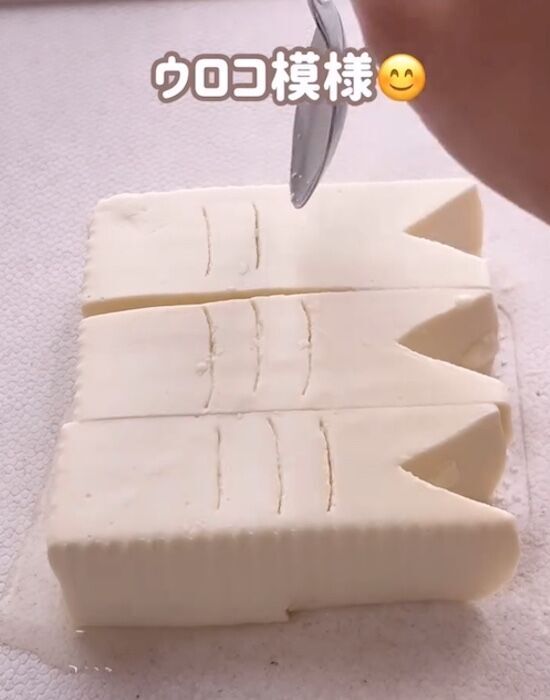 1.豆腐を3等分に切って、それぞれの端を三角に切りましょう。