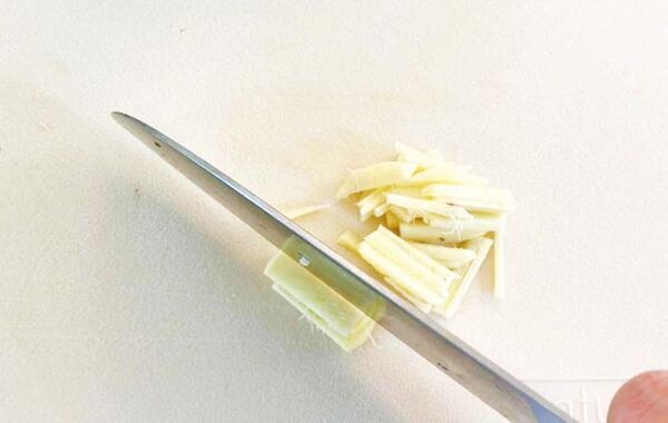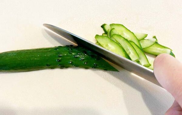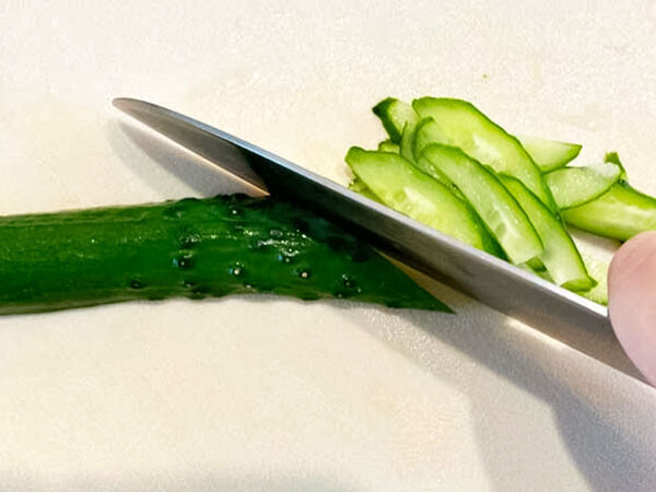 まずキュウリを縦半分に切り、斜めの薄切りにします。